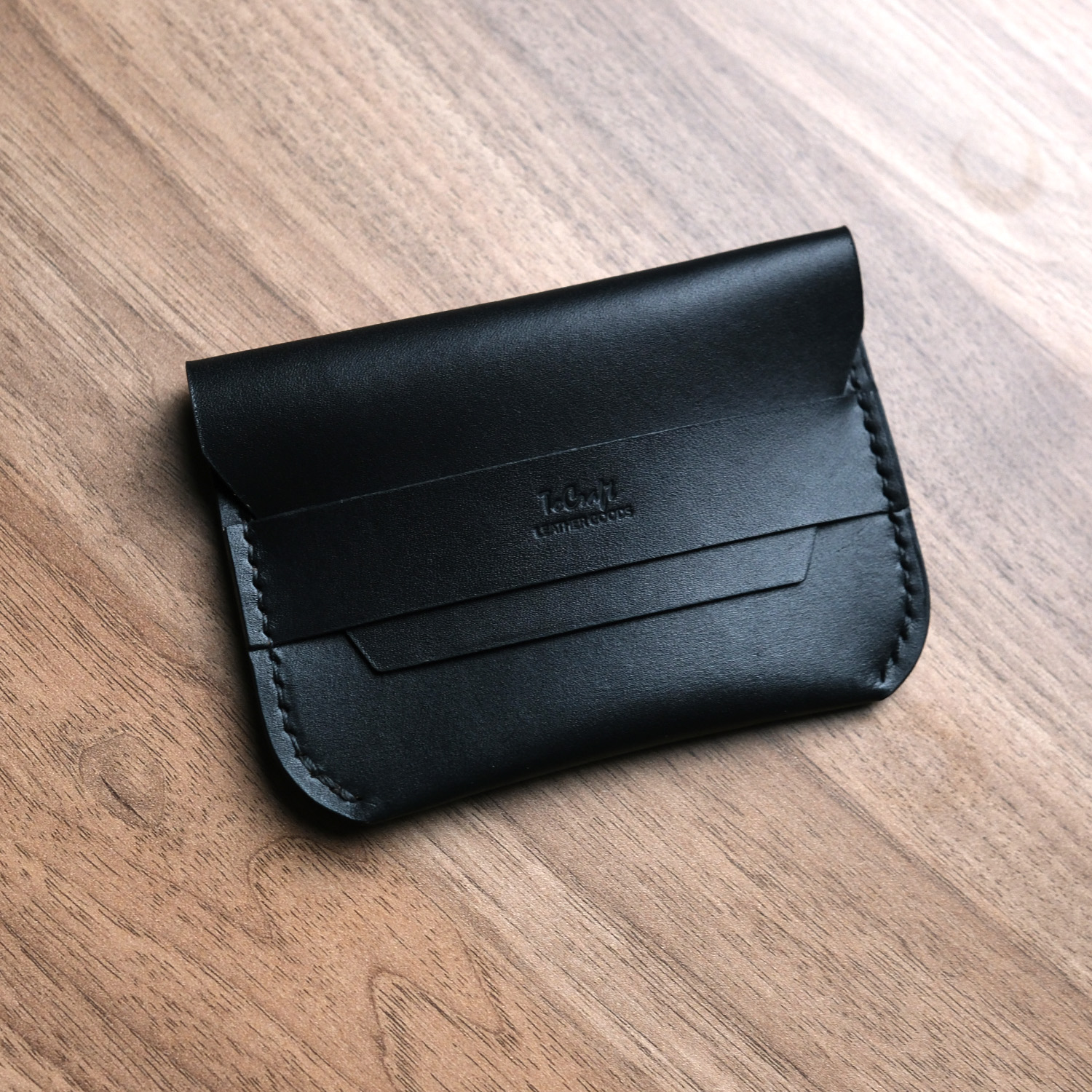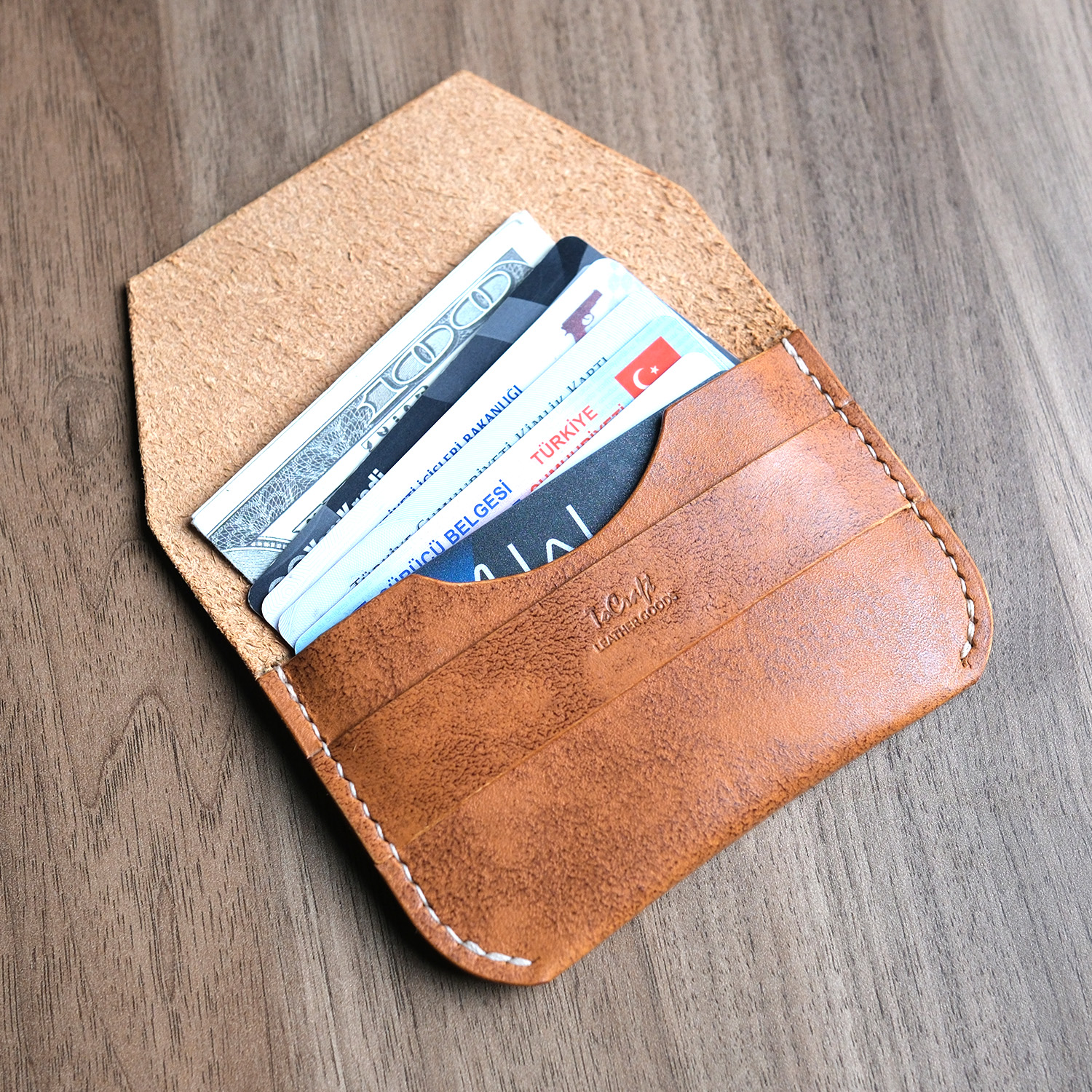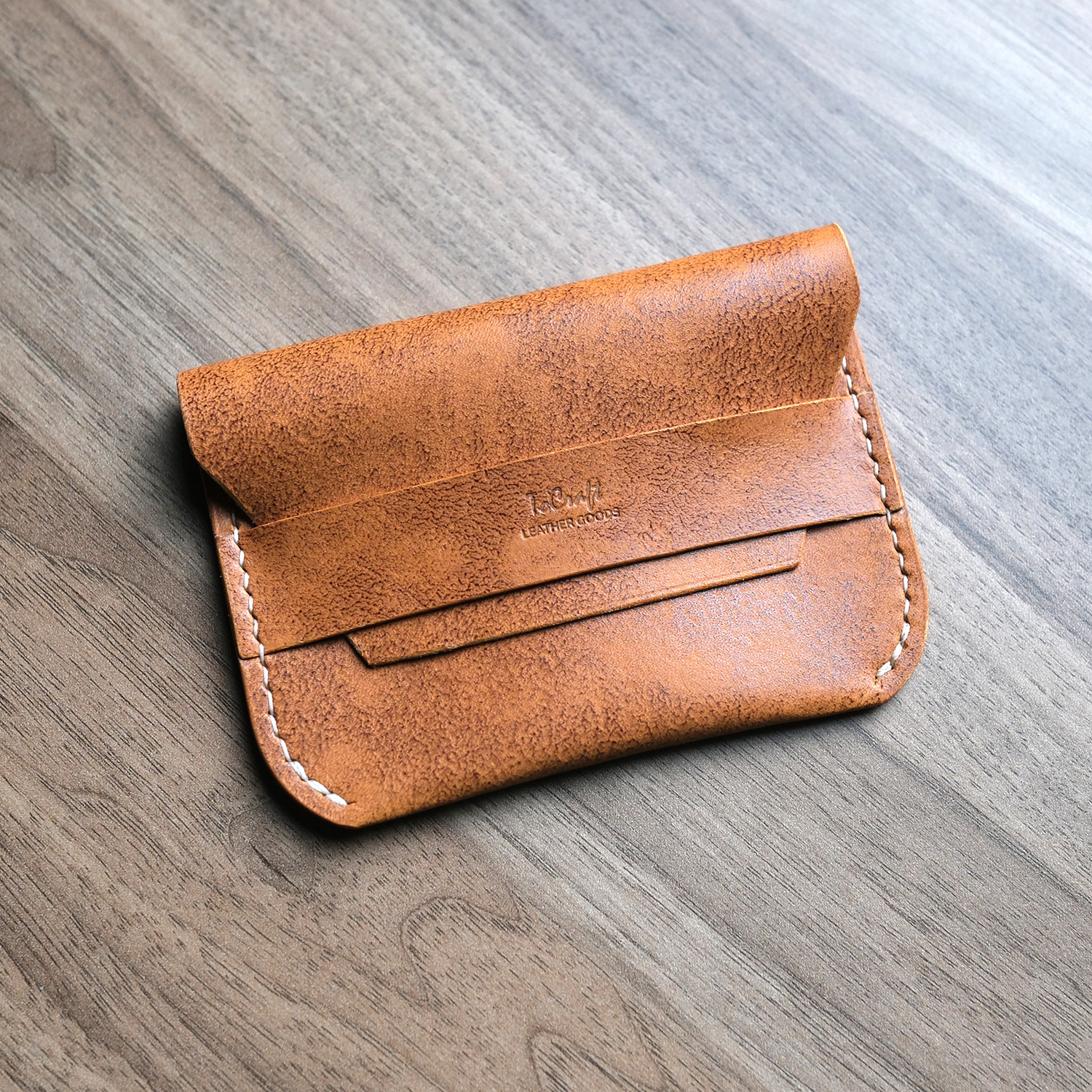 Leather Flap Wallet, %100 hakiki deriden tamamen el yapımı olarak üretilmiş minimalist bir cüzdan modelidir. 0.5 mm mumlu iplikle elde dikilen bu cüzdan, kişiye özel tasarım ile sunulmaktadır.