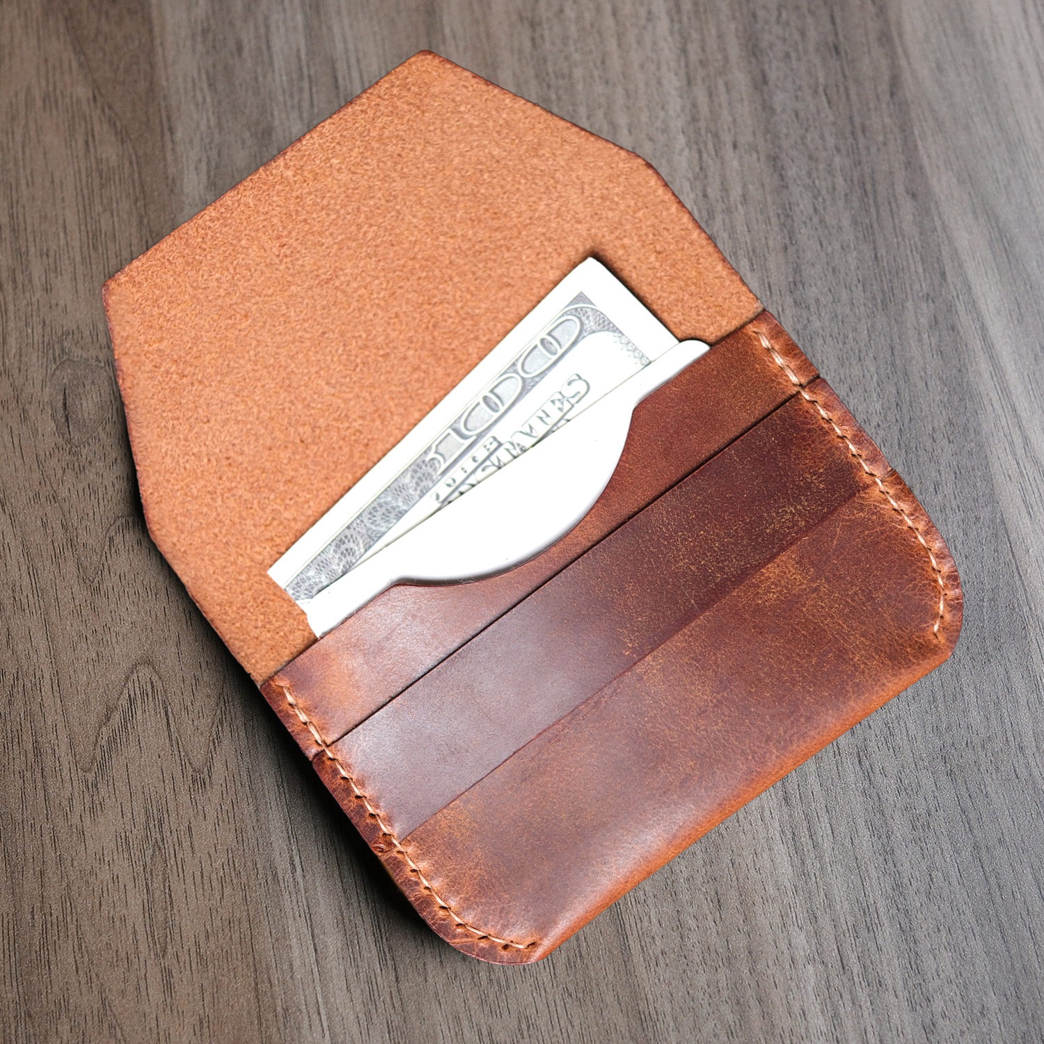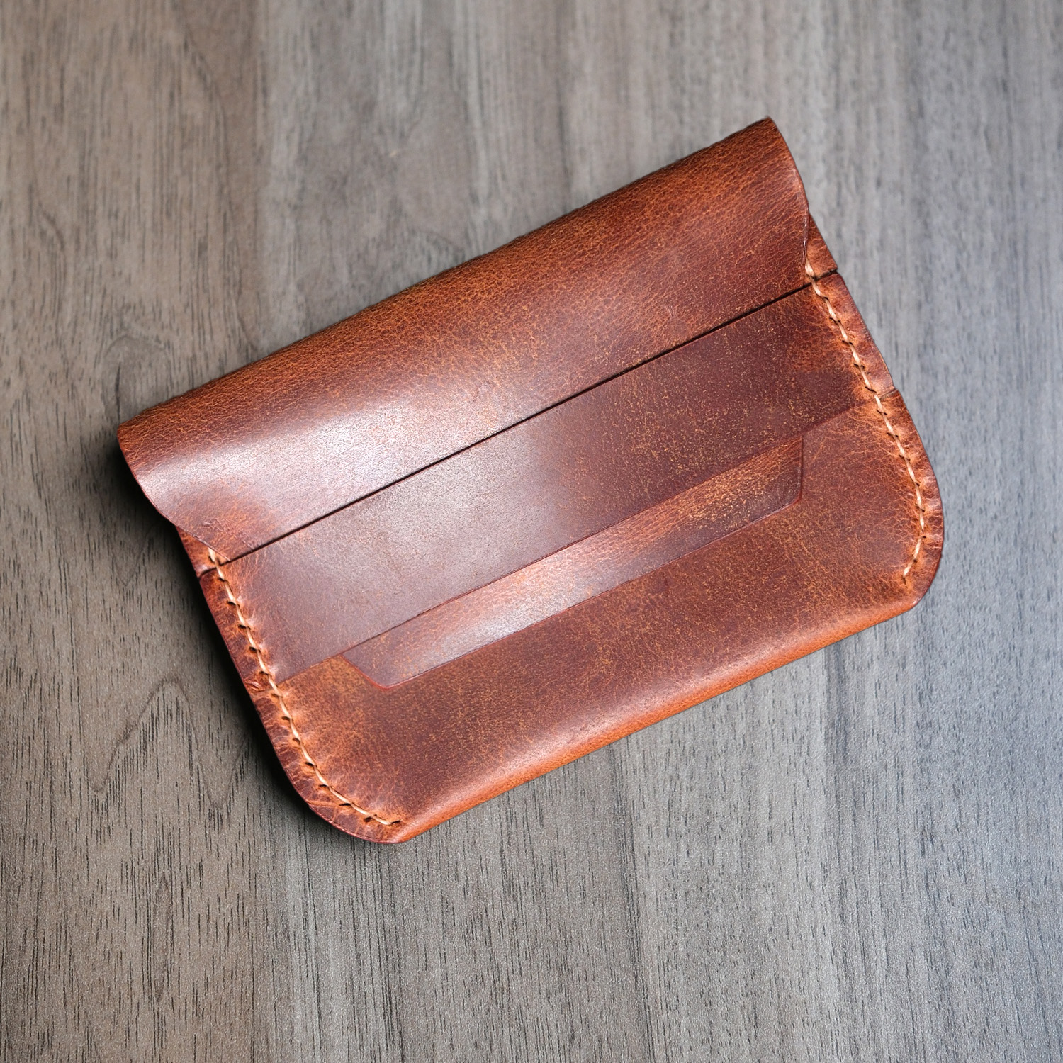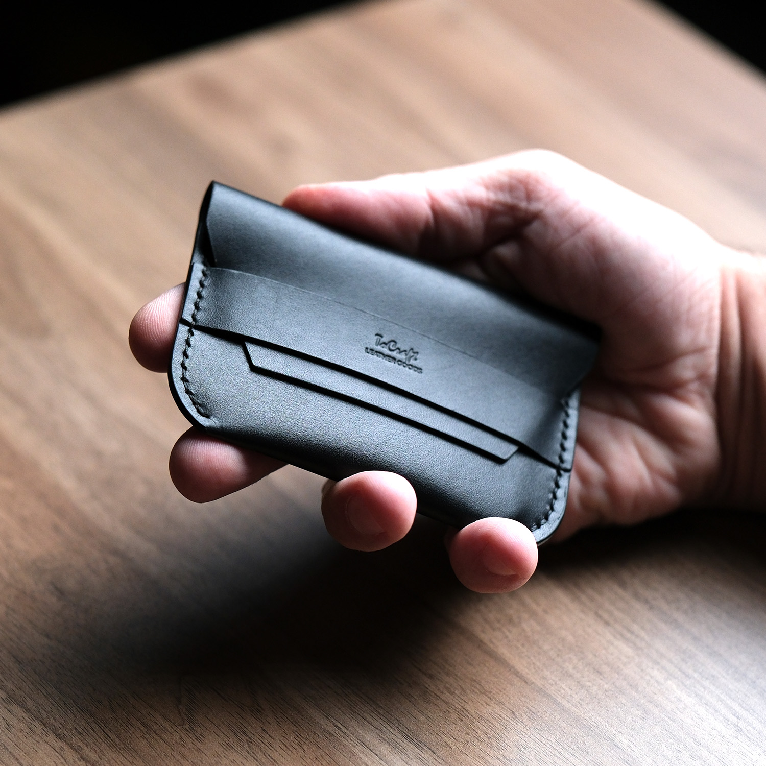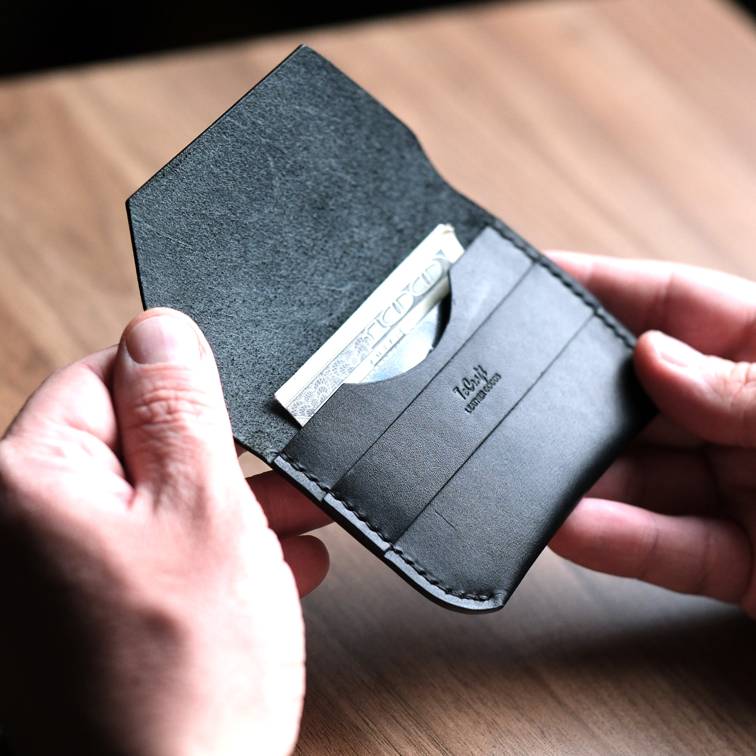 Leather Flap Wallet, %100 hakiki deriden tamamen el yapımı olarak üretilmiş minimalist bir cüzdan modelidir. 0.5 mm mumlu iplikle elde dikilen bu cüzdan, kişiye özel tasarım ile sunulmaktadır.